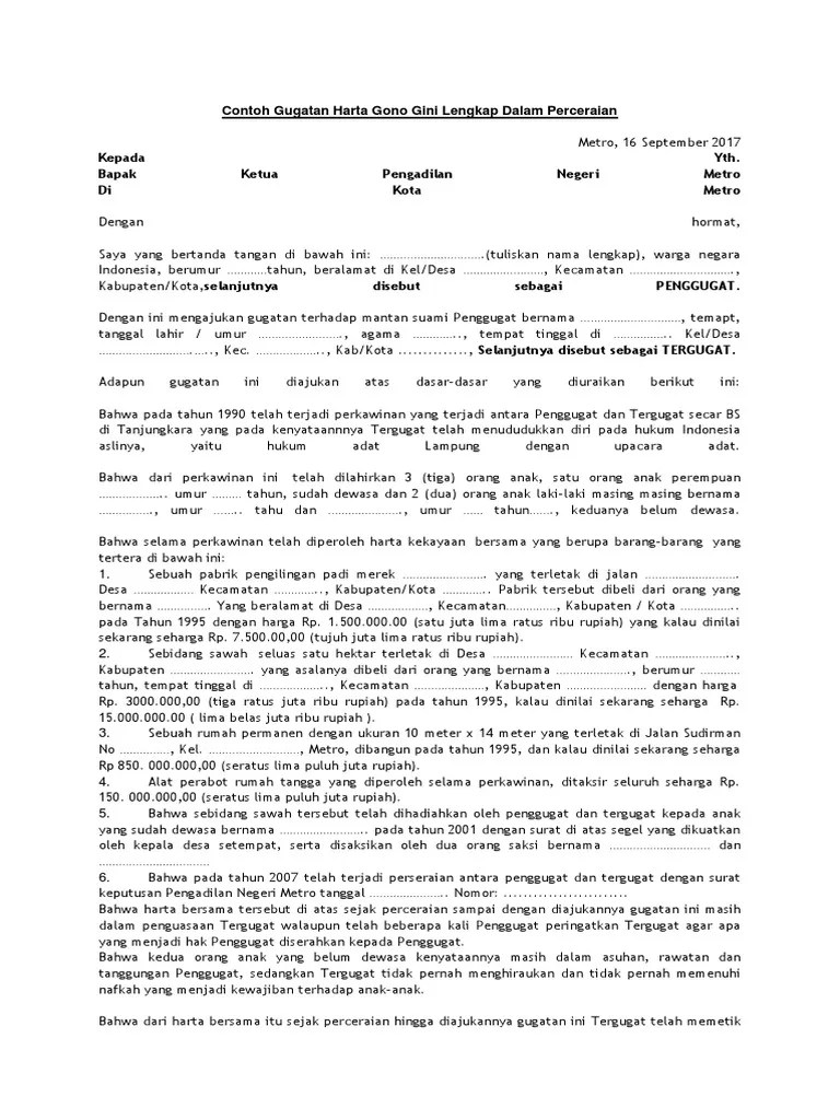 Untuk memudahkan masyarakat untuk mengajukan gugatan di pengadilan tata . Harta bersama / gono gini, artinya harta yang . Gugatan harta bersama lamp : Harta brsama yang sudah ada, dan tetap menjadi milik pemohon dan. Surat kuasa penyelesaian gono dan gini ini contoh surat kuasa untuk penyelesaian kasus perdata dalam hal ini kasus harta gono gini yang bisa .